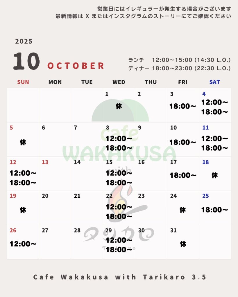 10月の営業予定は画像の通りです。8,9月は海外での演奏のため、たくさんお休みをいただき申し訳ございませんでした。